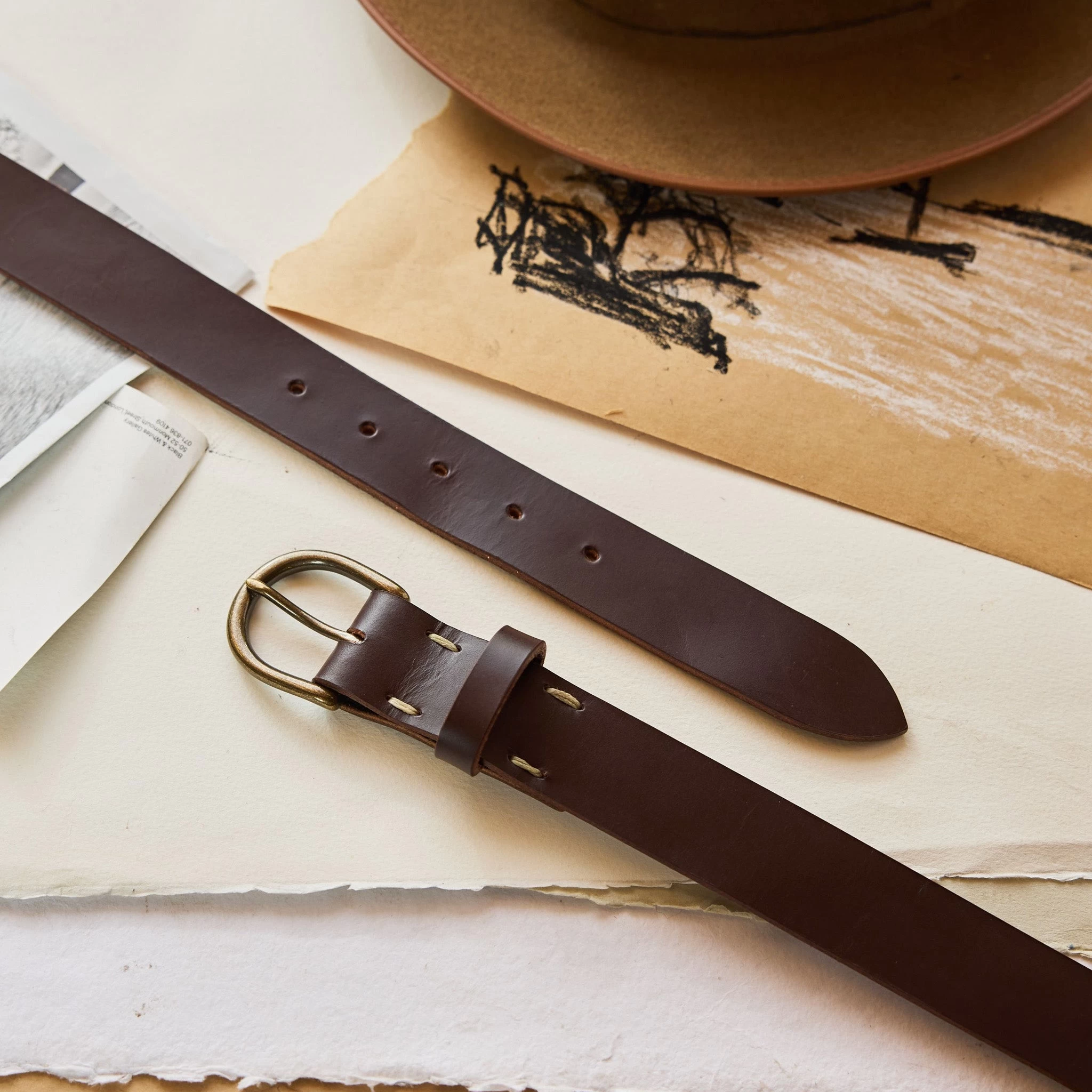 - Rounded antique brass buckle.